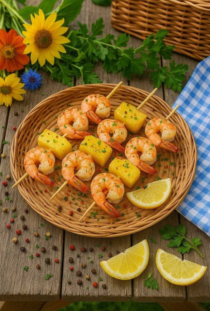Креветки с ананасом на шпажках Это лёгкое и яркое блюдо идеально подойдёт для пикника или летнего ужина. Сочетание сладкого ананаса и нежных креветок не только освежает, но и помогает ускорить метаболизм. Богато белком, витаминами и ферментами, особенно бромелаином, который улучшает пищеварение. Ингредиенты: - 500 г очищенных крупных креветок - 200 г свежего ананаса (нарезать кубиками) - 1 ч. л. оливкового масла - Сок 1/2 лимона - Щепотка соли и перца - Зелень для подачи Приготовление: 1. Креветки промойте, обсушите и сбрызните лимонным соком, посолите и поперчите. 2. Ананас нарежьте кубиками, нанизывай на шпажки, чередуя с креветками. 3. Слегка смажьте оливковым маслом. 4. Обжарьте на гриле по 2–3 минуты с каждой стороны до золотистого цвета. 5. Подавайте с зеленью, свежими лимонными дольками и охлаждённой водой с мятой.