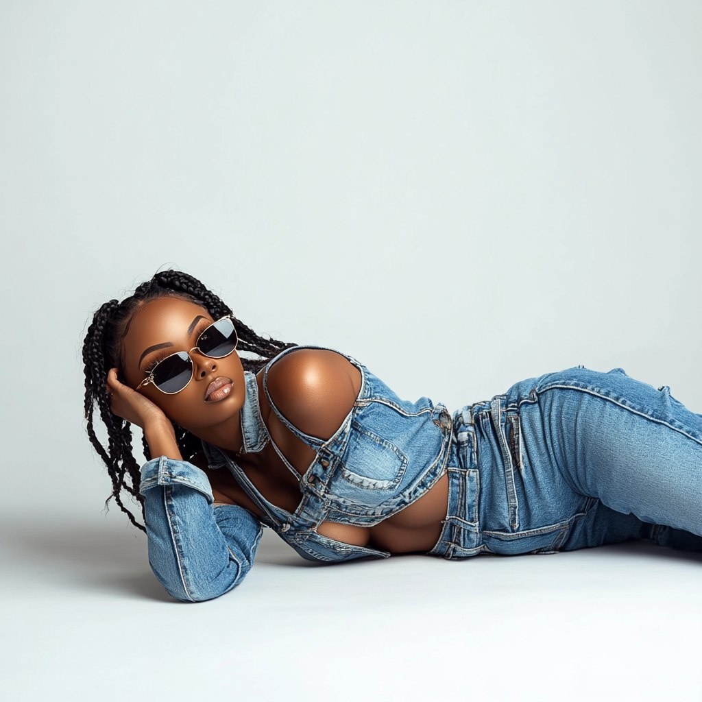 Создано на основе запроса: black beautiful woman with nice shape dressed in denim laying on her side with sunglasses
