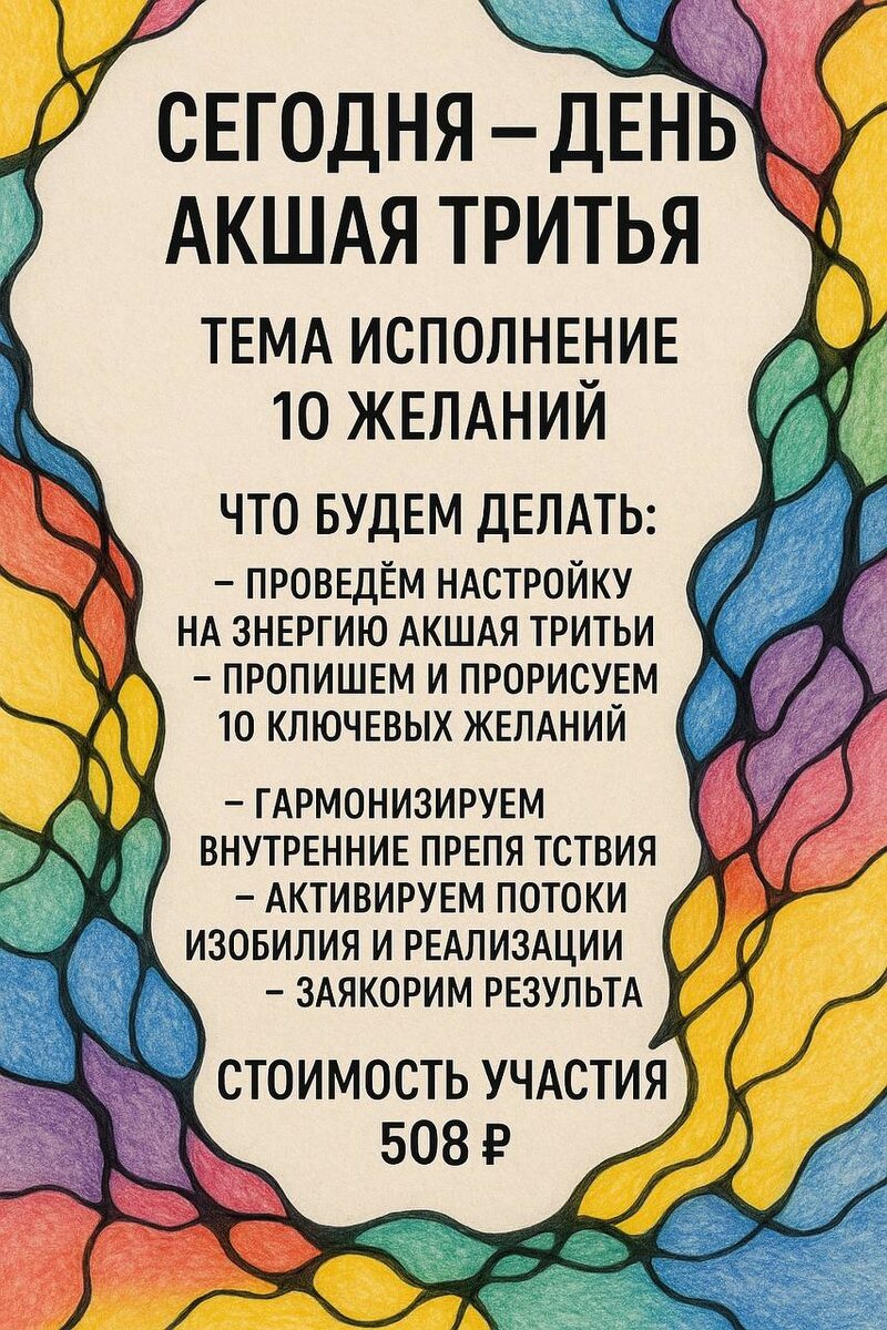 Нейрографика! Сегодня — особый день Акшая Тритья! Один из самых мощных дней года для исполнения желаний и начала всего нового. Всё, что заложено сегодня — приумножается и несёт благословение. Приглашаю на нейрографическую практику “10 ЖЕЛАНИЙ” в 19:00 по МСК! Мы не просто нарисуем желания — мы активируем их в потоке, в сакральный день, когда Небо слышит каждое намерение. Что будем делать: — проведём настройку на энергию Акшая Тритьи — пропишем и прорисуем 10 ключевых желаний — гармонизируем внутренние препятствия — активируем потоки изобилия и реализации через нейролинии — заякорим результат Эта практика подходит, если ты: — чувствуешь, что время пришло — хочешь придать сил своим желаниям — готов(а) убрать внутренние блоки и двигаться вперёд — хочешь соединиться с сакральной силой этого дня 💳 СТОИМОСТЬ УЧАСТИЯ — 508₽ 📌 РЕКОМЕНДАЦИИ: Подготовь бумагу, чёрный маркер, цветные карандаши или фломастеры. Создай уютное пространство, зажги свечу — мы работаем с намерением. Пиши в ЛС д