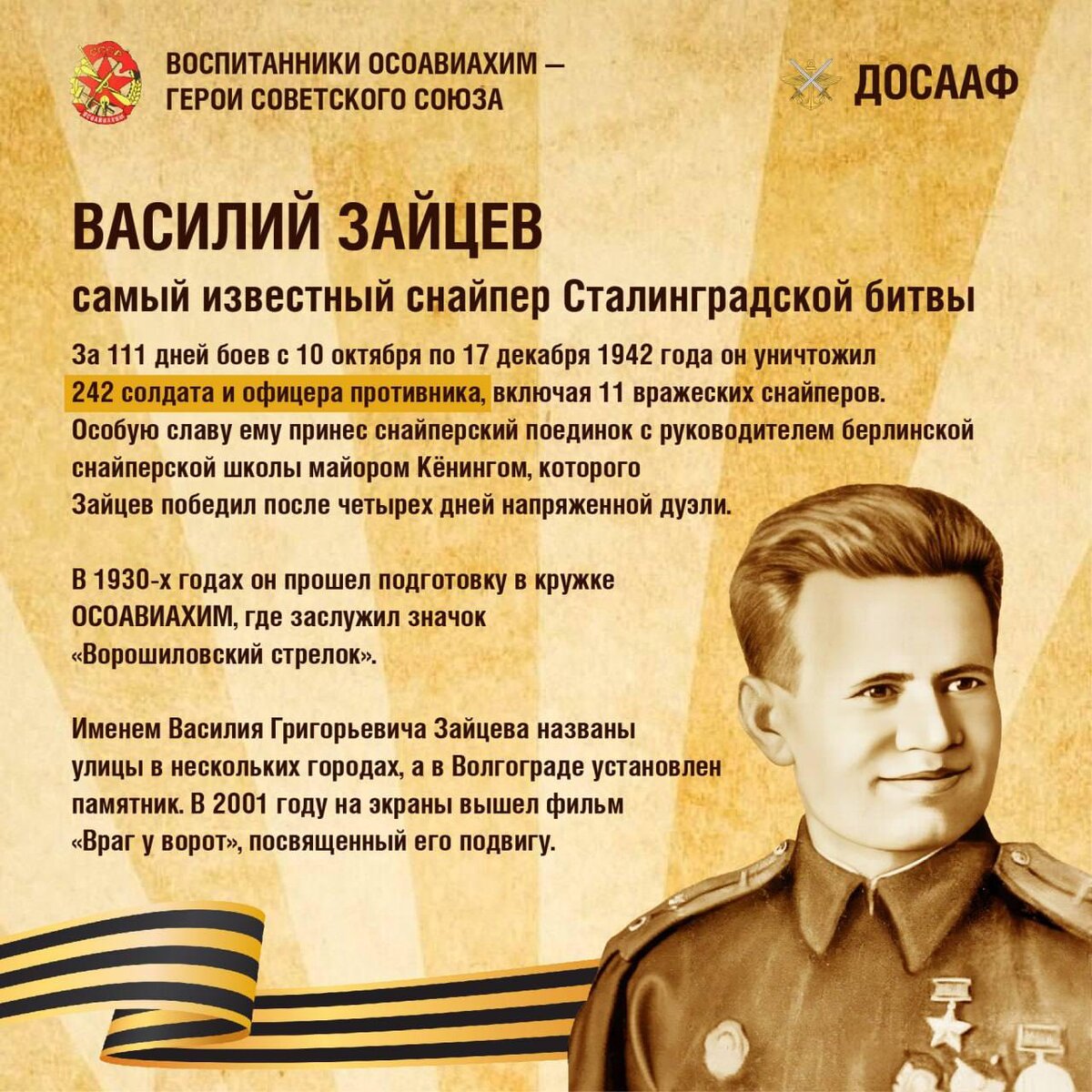 Воспитанники ОСОАВИАХИМ — Герои Советского Союза: Василий Зайцев — самый известный снайпер Сталинградской битвы Василий Григорьевич Зайцев (1915-1991) стал одним из самых известных снайперов Сталинградской битвы. За 111 дней боев, с 10 октября по 17 декабря 1942 года, он уничтожил 242 солдата и офицера противника, включая 11 снайперов. Особую славу ему принес снайперский поединок с руководителем берлинской снайперской школы, майором Кёнингом, которого Зайцев победил после четырех дней напряженной дуэли. Свои первые стрелковые навыки Зайцев получил еще в детстве, обучаясь у деда-охотника в уральской тайге. В 1930-х годах он прошел подготовку в кружке ОСОАВИАХИМ, где заслужил значок «Ворошиловский стрелок». Позднее, служа на Тихоокеанском флоте, продолжил совершенствовать свое мастерство. Этот опыт стал основой его будущих фронтовых успехов. После войны Василий Григорьевич Зайцев окончил Всесоюзный институт текстильной и легкой промышленности, работал директором швейной фабрики в Киев