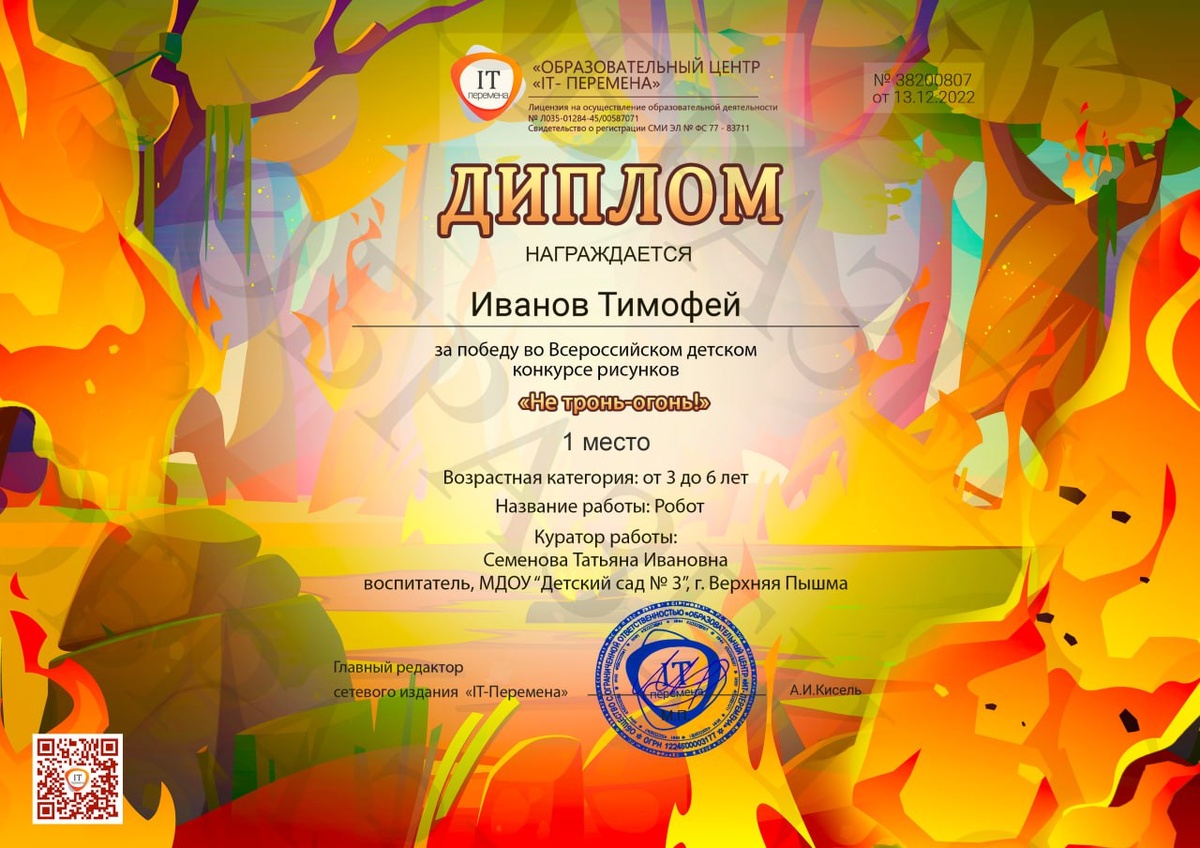 Мы подвели итоги бесплатного Всероссийского детского конкурса рисунков "Не тронь-огонь!"! Результаты и наградные документы уже размещены в нашем новом поисковом телеграм-боте "Переменка": https://t.me/itperemenka_bot На сайте на странице результатов итоги будут опубликованы 5 мая в 8:00 по МСК. Заказать оригиналы наградных документов, напечатанных в высоком качестве на плотной бумаге, можно под соответствующим дипломом.