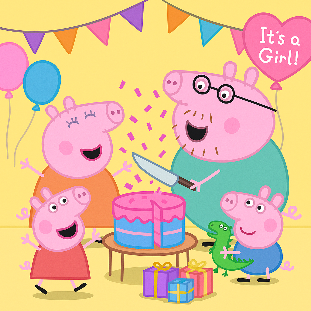 Семья Свинки Пеппы готовится к пополнению! Совсем недавно в доме Свинок прошло торжественное гендер-пати, где родители — Мама Свинка и Папа Свин — наконец узнали, кто же у них родится: мальчик или девочка? И знаете что? Это будет девочка! Что такое гендер-пати и как всё прошло у Свинок? Гендер-пати — это праздник, на котором будущие родители узнают пол своего ребёнка. И хотя в мультфильмах такое случается редко, в семье Свинки Пеппы всё было как в реальной жизни: воздушные шары, сладкий стол, приглашённые друзья и главный сюрприз — большой торт с секретом внутри. На вечеринке были: Момент истины: “О, это девочка!” Когда Папа Свин разрезал торт, изнутри посыпались розовые конфетти. Пеппа закричала от восторга, а Мама Свинка прослезилась от счастья. Джордж немного расстроился, но потом с улыбкой сказал: “Хорошо, если она будет любить динозавров, как я!” Все начали хлопать, а друзья стали дарить первые подарки для малышки — розовые пинетки, игрушки, маленький плюшевый медвежонок и бод
