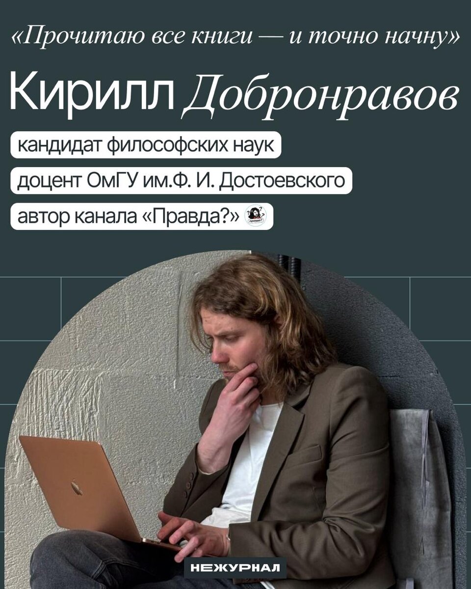 📖 «Прочитаю все книги — и точно начну» Мы продолжаем рубрику «Авторская колонка». В ней мы даём возможность делиться своими мыслями городским лидерам мнений. Сегодня с нами Кирилл Добронравов — кандидат философских наук, доцент ОмГУ им. Ф.М. Достоевского и автор канала «Правда?». 📰 Подпишись на «Не журнал» | #АвторскаяКолонка