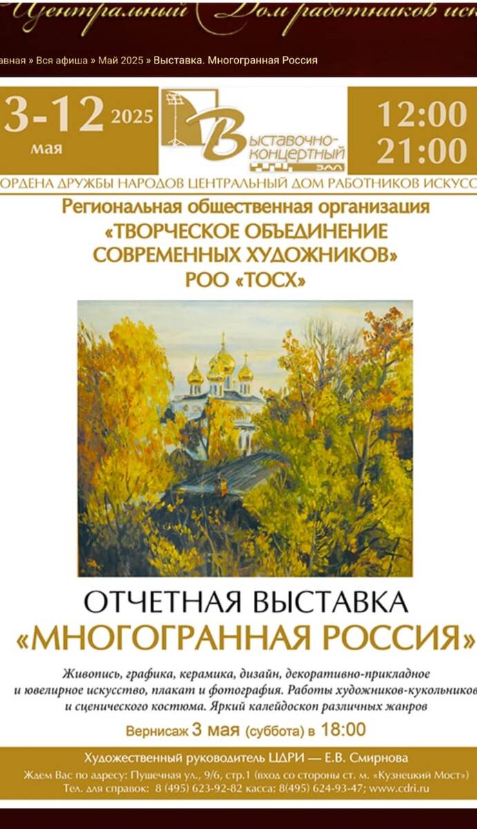 Региональная общественная организация «Творческое объединение современных художников РОО «ТОСХ» с 03 по 12 мая проводит ежегодную отчетную выставку «Многогранная Россия». На выставке будет представлены работы по живописи, графике, керамике, дизайну, декоративно-прикладному и ювелирному искусству. Вас ждёт интереснейшая программа и работы, а также калейдоскоп различных жанров искусства! Для прохода на выставку скачайте билет-афишу в свой мобильный телефон и предъявите его при входе на выставку. До встречи на выставке!