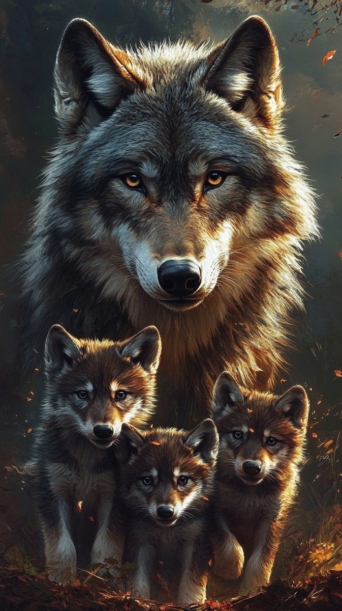 Создано на основе запроса: realistic image of a wolf with three cubs below