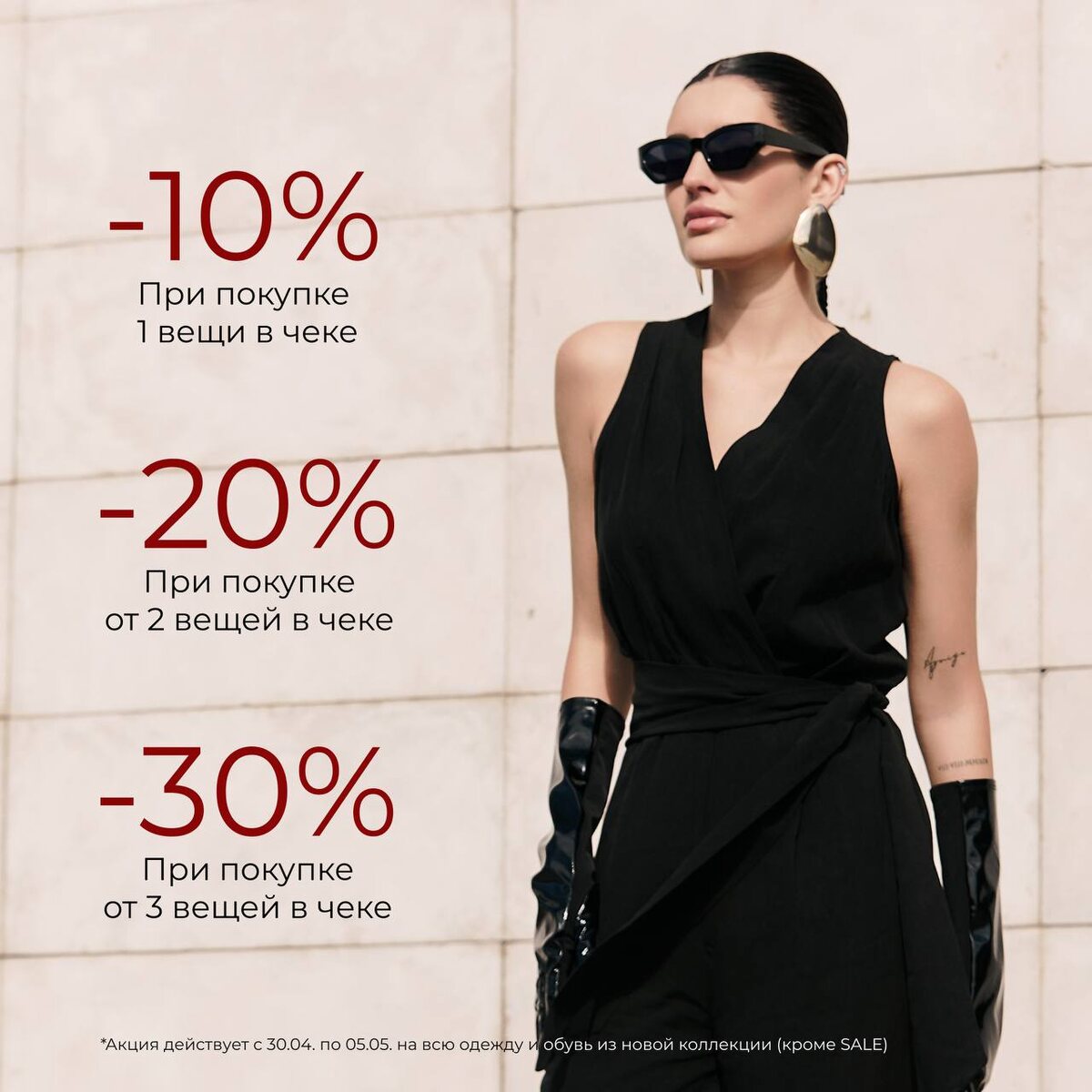 Весна в самом разгаре, а это значит, что пора обновить свой гардероб и подготовиться к летнему сезону! В период с 30 апреля по 5 мая (включительно), онлайн-магазин SAVAGE дарит вам возможность сделать это с максимальной выгодой, воспользовавшись нашими большими майскими скидками! Мы предлагаем СКИДКИ до 30% на все товары (кроме SALE) из новой коллекции. 10% — на 1 позицию в корзине 20% — на 2 позиции 30% — на 3 и более позиции Скидка рассчитывается автоматически. Вам не нужно вводить никаких промокодов. Удачных покупок! ❤️ savage.ru