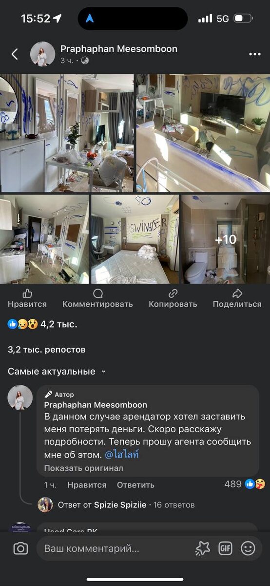 Украинка разрушила арендованный кондо на Пхукете: ущерб на сотни тысяч батов Владелица квартиры в кондоминиуме на территории Вичит, Пхукет, была шокирована состоянием своей недвижимости после сдачи её в аренду через агентство. Пострадавшая опубликовала фото и рассказ на Facebook, предупреждая других о возможных рисках. Согласно сообщению, квартира была сдана в аренду женщине из Украины с 15 апреля 2024 года по 15 апреля 2025 года. Однако арендатор не освободила помещение в срок, и лишь 29 апреля прислала сообщение, что выехала, оставив ключи в мусорном баке. Когда персонал вошёл в квартиру, они обнаружили катастрофические разрушения: мебель была поломана, бытовая техника — разбита, а стены и потолок — исписаны непристойными словами и граффити. Внутри также были надписи «32,000» и «SWINDLEE». Предварительная оценка ущерба составила не менее 350,000 батов. Владелица уже обратилась в полицию, и в отношении бывшей арендаторши будет возбуждено уголовное дело. Инцидент вызвал широкий ре