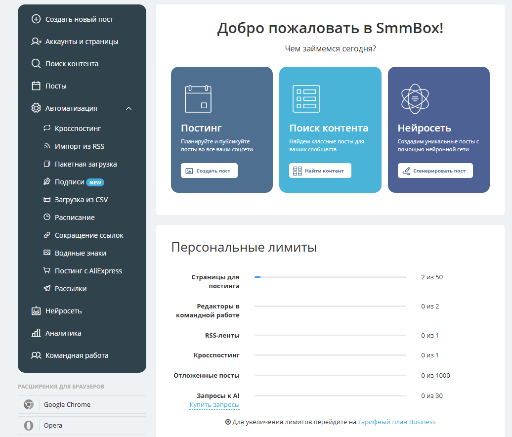 В SMMBox есть бесплатный 14-дневный пробный период. Платные тарифы стартуют от 500 рублей в месяц.
