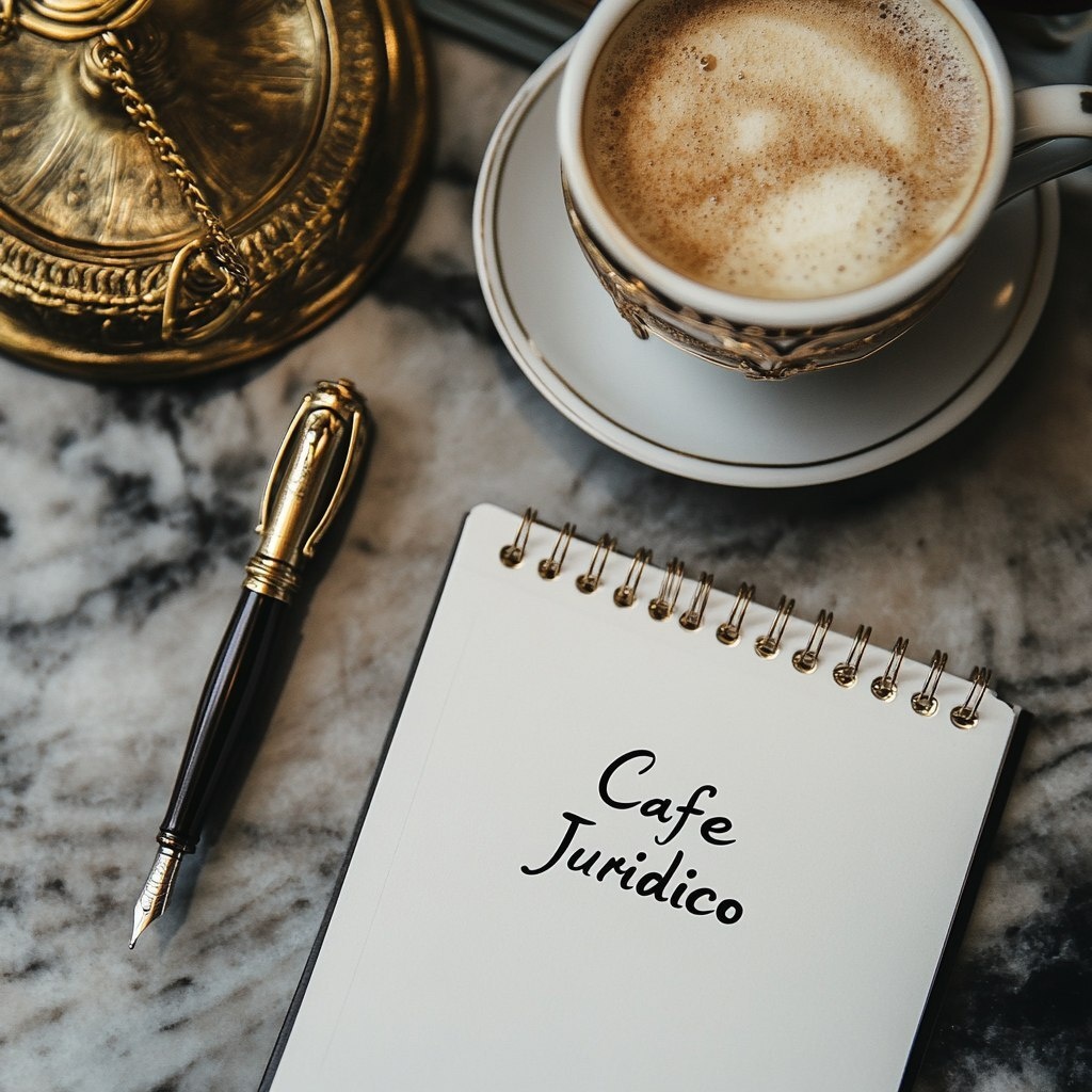 Создано на основе запроса: Overhead flat-lay view of a coffee table: miniature scales of justice, a fountain pen, a notepad with "Café