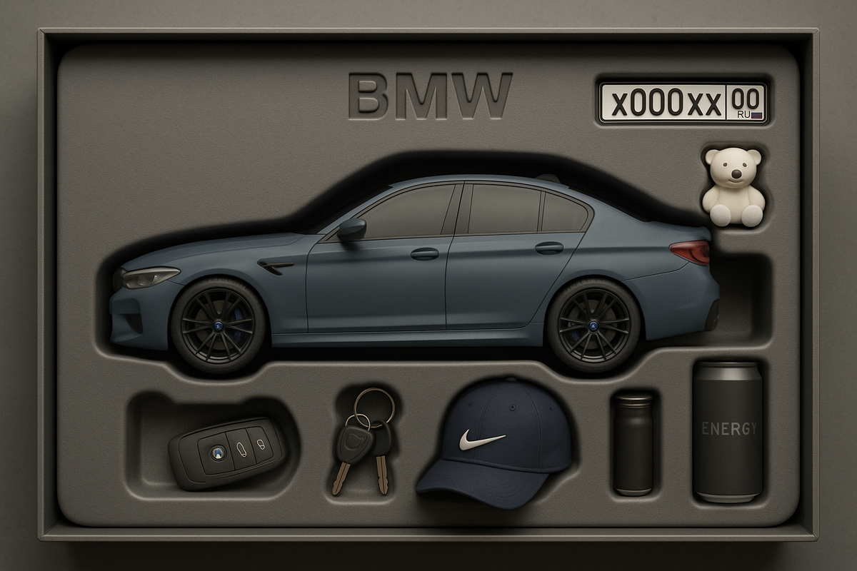 Если вы задумывались как сделать 3D фигурки своей машины, как показано на рисунке ниже: 3D фигурка машины из soft touch пластика. Машинка должна находится в коробке боком. Машина - (Марка авто) копируй каждую деталь, фары, колеса, стекла, двери и пропорции. Акцент на стиль и текстуры. Машина лежит в пластиковом углублении, которое повторяет ее силуэт. Создай коллекционную экшн-фигурку машины как дорогую игрушку в упаковке. Стиль: Максимально реалистичный, как для рекламы. Картинка должна быть горизонтальной! Надпись (надпись которая будет сверху) - буквы в печатаны и выгравированы на коробке в верхней части, цвет коробки серый. Аксессуары внутри коробки: Разложены их рядом с игрушкой по своим местам в отдельных ячейках. Обязательно добавь в отдельные ячейки: регистрационный российский номера - ( номер машины с регионом) регион, белого медвежонка, брелок, (и тому подобное что должно лежать в коробке).