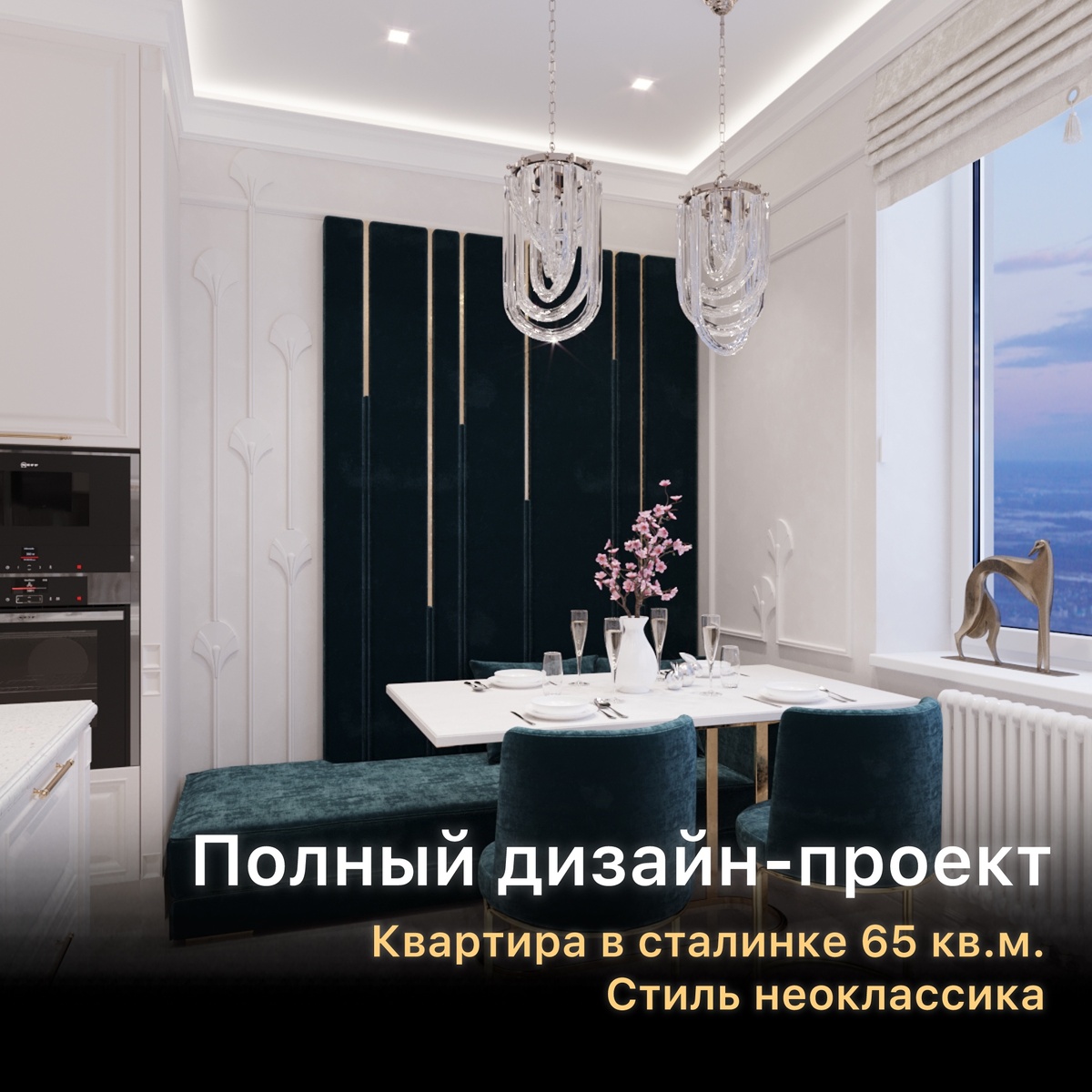 Квартира 65 кв.м. в стиле неоклассика Очаровательный проект, как и семья, для которой мы его создавали! Работа проходила на редкость легко и радостно, включая процесс визуализации — которая, кстати, подарила нам приятный сюрприз в детской. Но обо всём по порядку! В сталинках нередко есть ограничения по модернизации окон, дверных проемов, электросетей и коммуникаций, что требует аккуратных решений и согласований с соответствующими службами. Дизайн кухни – тоже в стиле неоклассика: белые фасады практичны в уходе и хорошо гармонируют с техникой чёрного цвета, фартук, подоконник и столешница чуть освежают помещение. В небольшой квартире важно правильно организовать пространство, чтобы оно было функциональным и визуально просторным. В условиях ограниченных площадей приходится искать баланс между декоративной отделкой и практичностью. В сталинках часто присутствуют массивные несущие стены, которые не предусматривают свободную перепланировку. Это ограничивает возможность кардинальных измене