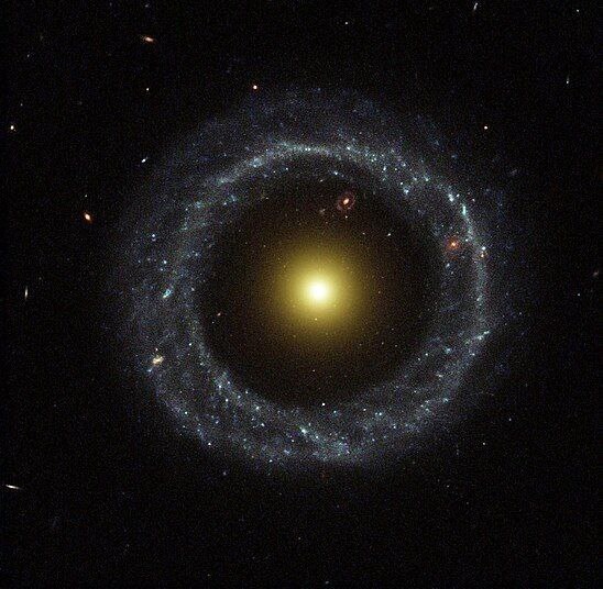 #этоинтересно ✨Объект Хога - очень редкий вид кольцевых галактик. ➡️Внешние звезды отделились от ядра и сформировали кольцо. Эта галактика отличается удивительно правильной формой и симметрией. ✅Еще более удивительно то, что сквозь нее видна более далекая еще одна кольцевая галактика (в верхней части).