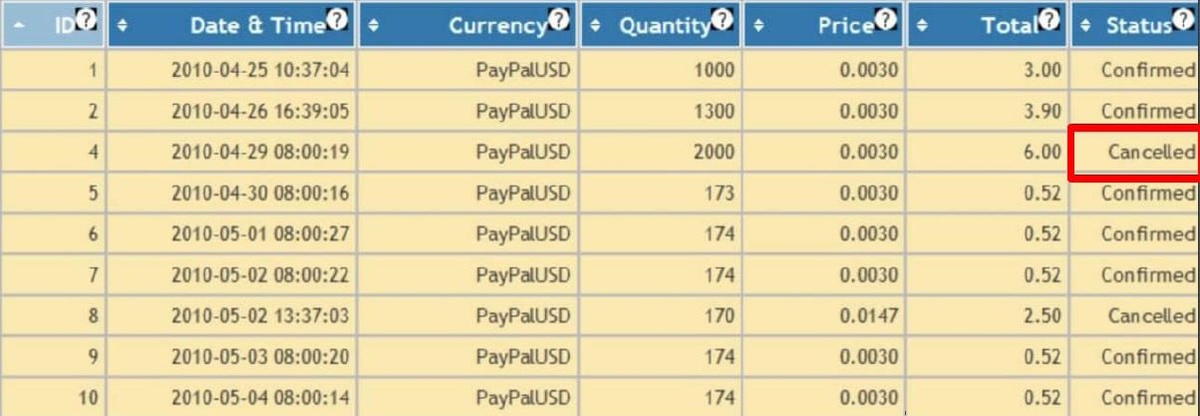 Архив продаж биткоина в 2010 году.