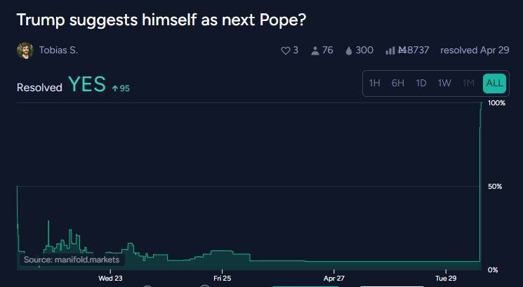 На платформе ставок Manifold неожиданно сработала ставка: «Заявит ли Трамп о желании стать Папой Римским?» И что вы думаете? Вчера, 29 апреля, в одном из интервью Дональд Трамп спокойно заявил: «Я хотел бы стать Папой Римским. Это был бы мой первый выбор.» Конклав такие «мы вам что шутка какая то» 😂 💒😁