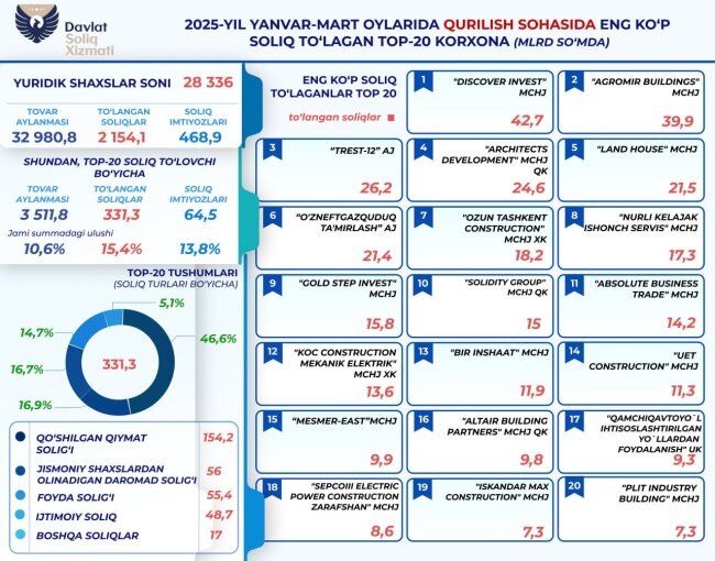 За первые три месяца 2025 года 28 336 юридических лиц, которые осуществляют свою деятельность в сфере строительства, уплатили в бюджет государства 2,1 триллиона сумов налогов. 331,3 миллиард из них приходится на 20 юридических лиц. Отмечается, что их товарооборот превысил 3,5 триллиона сумов, а общая сумма налоговых льгот составила 64,5 миллиарда сумов.