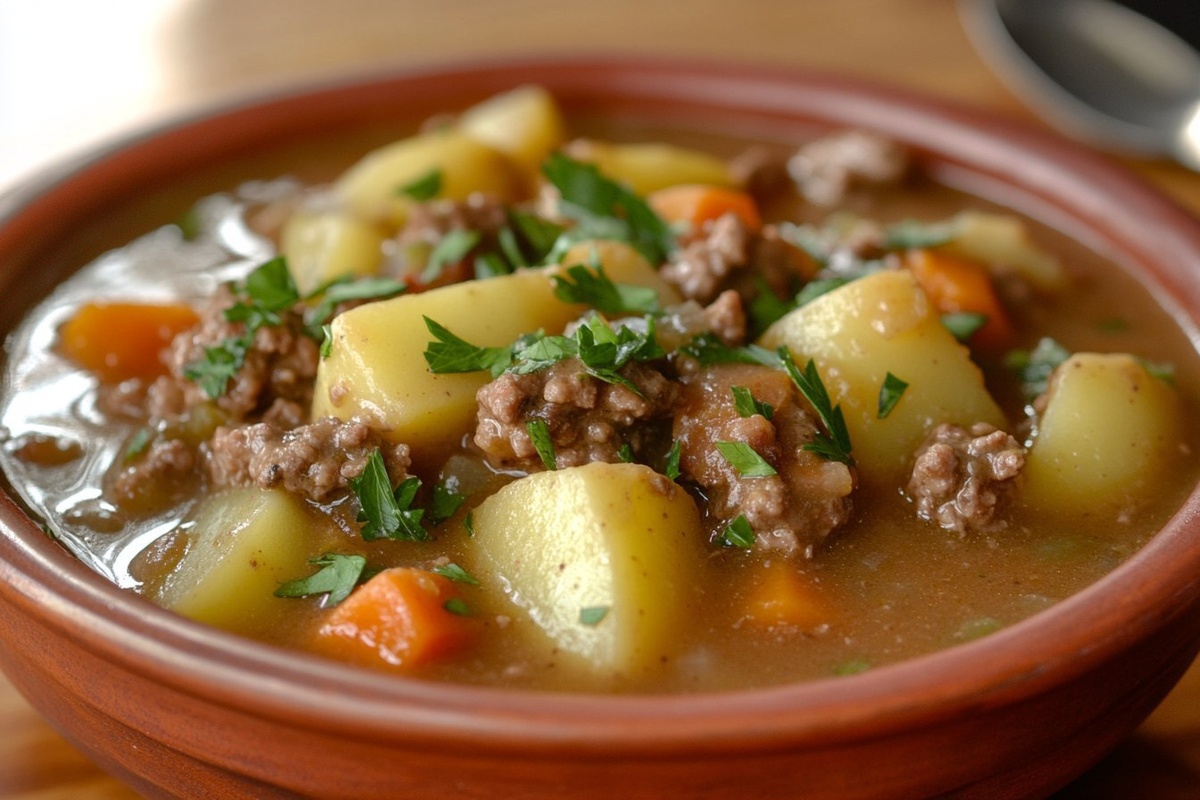 Создано на основе запроса: Title: Creamy Potato Hamburger Soup | STYLE: Close-up Shot right view | EMOTION: realistic as possible | SCENE