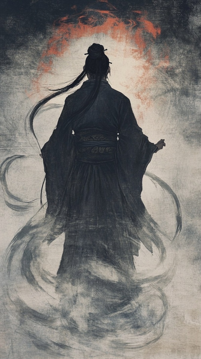 Создано на основе запроса: A Japanese god-like figure standing from behind, his aura is incredible