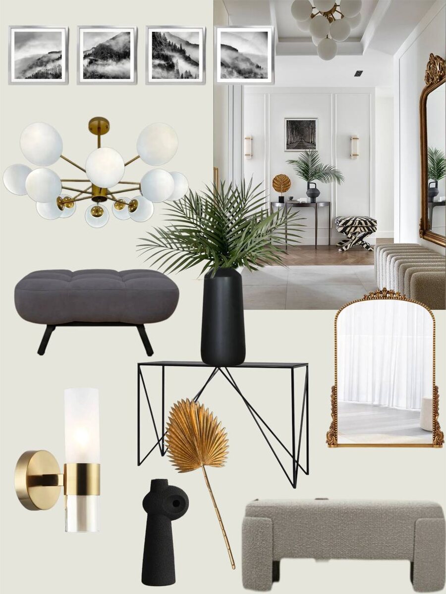 Привет, мои дизайнеры-любители! Сегодня будем творить чудеса и экономить деньги – создадим стильную прихожую, не продавая почку. 😉 Нашла фото с просто обалденным дизайном прихожей, но, погуглив цены, поняла, что проще продать квартиру и жить в этой прихожей. 😂 Одна банкетка там стоит около 100 000 рублей, если быть точной. Но не отчаиваемся! Мы же не ищем легких путей! В общем, я собрала для вас аналоги товаров с той самой картинки. Сразу скажу: это не попытка сделать точную копию. Мы же за креатив, а не за плагиат! Цель – создать стильный интерьер за разумные деньги. Чтобы осталось еще и для себя любимой. Итак, поехали: 1. Консольный столик: CARY 1200х855х280мм. Артикул Ozon: 713858428 2. Набор постеров "Горы черно-белые" без рамок, 30 на 30см Артикул Ozon: 1629734856 3. Зеркало настенное, 60 см х 80 см: Артикул Ozon: 1818551226 4. Банкетка в прихожую букле: Артикул ЯМ: 4930848333 5. Потолочная люстра золотая с 12 белыми матовыми шарами. Артикул Ozon: 844155343 6. Настенный