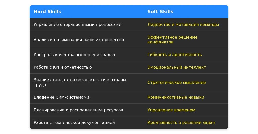 После адаптации: "Управление персоналом, организация работы смены, знание CRM-систем, решение конфликтных ситуаций".