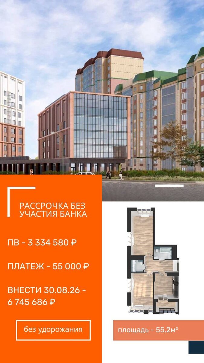 Рассрочка до 2026 года — без участия банка! ЖК «Солнечный город», ПК-14 Теперь 1- и 2-комнатные квартиры в уже обжитом районе и доме комфорт-класса можно приобрести на удобных условиях: • Без участия банка • Платежи до 30 августа 2026 года • Фиксированная ставка: всего 1000 руб./м² в месяц (с округлением) Дополнительные условия: • Страховка — обязательна • Платная бронь — 80 000 / 100 000 руб.