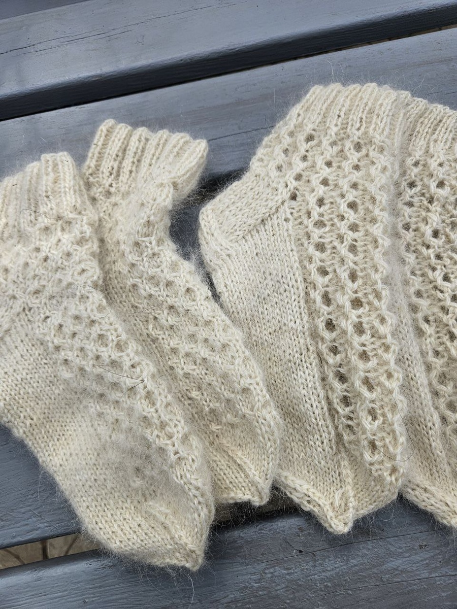 А вот ещё одни носки, белый пух придонских коз, напряден на чистую шерсть молочного цвета