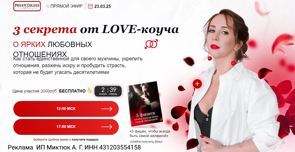 Онлайн курсы о Женственности — это уникальная возможность погрузиться в мир себя, понять свои желания и научиться гармонично сочетать внутреннюю силу и мягкость. Что тебя ждёт на таких курсах? - Понимание своей природы и истинных потребностей - Практики для развития уверенности и самооценки - Техники мягкости и обаяния в общении - Работа с внутренними блоками и страхами - Советы по стилю, уходу и здоровью - Поддержка и общение с единомышленницами Женственность — это не просто внешний образ, это состояние души, которое можно развивать и насыщать любовью к себе. Не упусти шанс раскрыть в себе источник вдохновения и гармонии — записывайся на онлайн курс и меняй свою жизнь уже сегодня! 💖 Как стать единственной для своего мужчины, укрепить отношения, разжечь искру и пробудить страсть, которая не будет угасать десятилетиями. Всего за 2 часа вы получите: 1.3 навыка необходимых для яркой интимной жизни и крепких отношений 2.Разбор женских ошибок, которые рушат отношения в 90% случаев. 3.Что ж