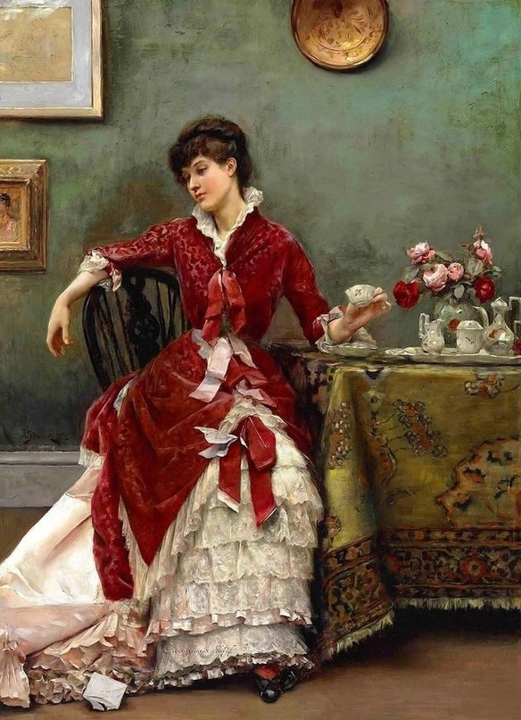 За утренним чаем красавица получила записку. Торопливо распечатав послание и пробежав глазами по строчкам, она скомкала листок и впала в меланхолическую задумчивость. Картина «Разочарование» написана Юлиусом Лебланом Стюартом в 1882-м году. По всей видимости, письмо поставило крест на недавних романтических отношениях. Подтверждением версии о скрытой любовной линии выступает увядающий букет роз. Крупные бутоны удручённо поникли, точь-в-точь как изящная головка женщины. Страдания не будут продолжительными. Волевой подбородок говорит о цельном и упрямом характере героини. Она не привыкла хандрить и опускать руки по незначительным поводам. Облик модницы продуман до мелочей. Даже чулки, еле заметные при ходьбе, подобраны в тон платью. Каскад пенного кружева перекликается с изящным чайным сервизом, а ансамбль бордовых и розовых бантов удачно гармонирует с «заскучавшими» в вазе цветами. Художник, родившийся в США, связал творческую судьбу со Старым светом. Стюарт долго жил и работал во Фран
