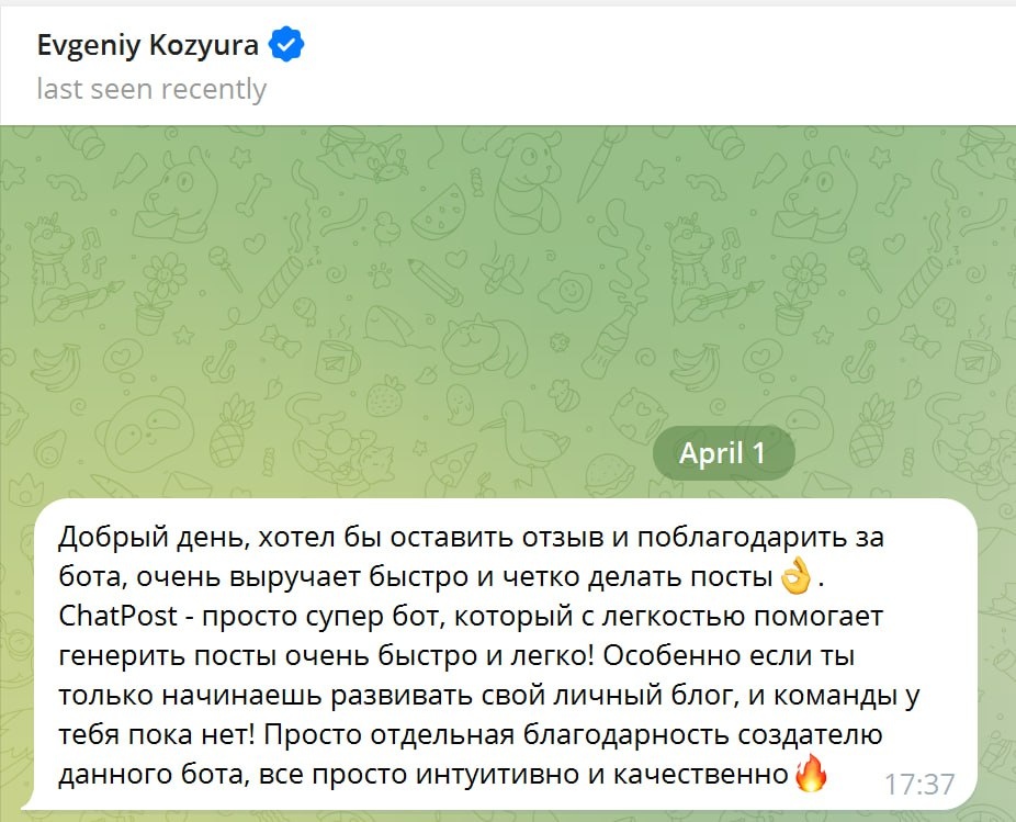Теперь Евгений ведет свой канал с помощью ChatPost бота. Оставяет теплые комментарий о его работе. Спасибо, очень рад вашей обратной связи!