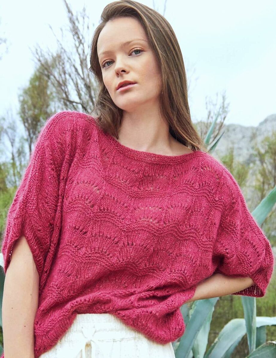 1. Главными героями этого очаровательного малинового пуловера оверсайз являются мохеровые и шёлковые волокна, а также прямые рукава, связанные одновременно с основным изделием. Красивый волнистый узор использован по всей поверхности и сочетается с узкими полосками платочной вязки — великолепный эффект, создающий трехмерность;