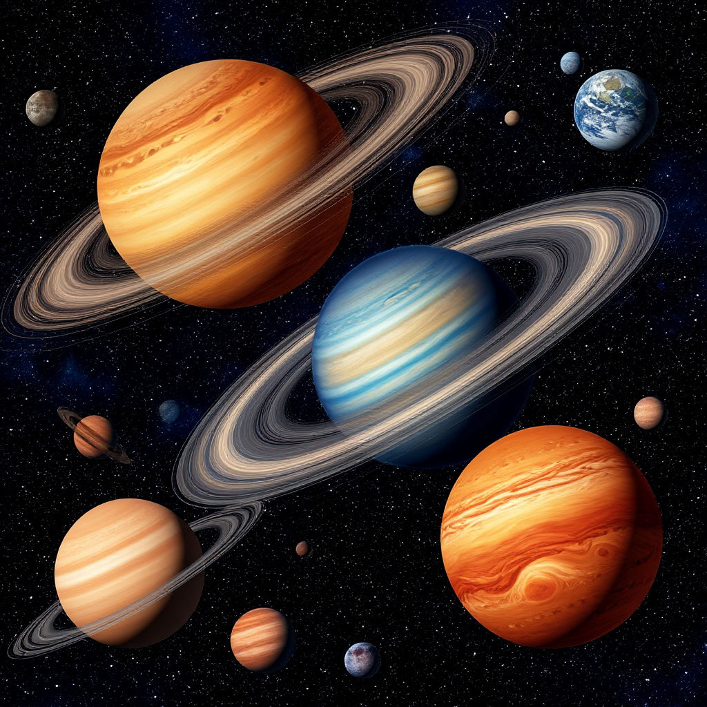 Вторая по величине планета в Солнечной системе, известная своими впечатляющими кольцами. Как и Юпитер, Сатурн состоит в основном из водорода и гелия. Кольца Сатурна состоят из бесчисленных частиц льда, пыли и камней, вращающихся вокруг планеты. Сатурн обладает множеством спутников, включая Титан, крупнейший спутник Сатурна, имеющий плотную азотную атмосферу и моря из жидкого метана и этана.