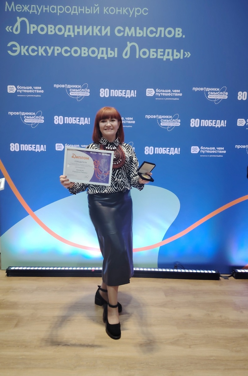 в номинации "Лучший экскурсовод в ином населённом пункте на территории России и Белоруссии". Конкурс реализован программой Росмолодежи "Больше чем путешествие", посвящен 80-летию Победы, ключевая тематика экскурсий военно-патриотическая, связанная с Великой Отечественной войной.