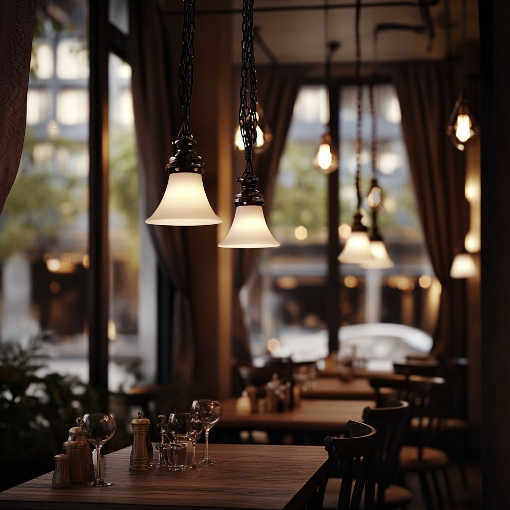 Создано на основе запроса: A cozy, vintage-style restaurant interior with black cable pendant lights hanging from the ceiling, featuring opal matt glass shades with elegant drapery design, casting a soft warm glow over wooden dining tables, Victorian-inspired decor, ultra-realistic lighting, 4K render, evening setting --- Автоперевод: Уютный, винтажный ресторан интерьера с черным кабельным подвесным освещением, висящим на потолке с опалом матовыми стеклянными оттенками с элегантным дизайном драпировки, набрав мягкое теплое сияние на деревянных столах, в викторианском декоре, ультра-реально Красиво получилось? 🤔 https://dzen.ru/id/65c0c65c86e4f837c27b24d7 #ИИ #AI #нейросеть #midjourney #art