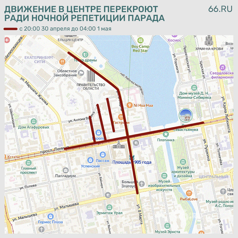 Движение транспорта перекроют с 20:00 30 апреля до 04:00 1 мая. Перекрытия будут действовать в это же время еще 2 мая и 5 мая. Проехать нельзя будет по: На это время общественный транспорт будет ездить по измененному маршруту. Трамваи: Автобусы: Главная новость по теме В честь 80-летия Победы впервые за три года в Екатеринбурге проведут «Бессмертный полк». На Плотинке пройдет традиционный концерт, а вечером запустят салют. Проезд по центру перекрыли не только для автомобилистов, но и для тех, кто ездит на электросамокатах.