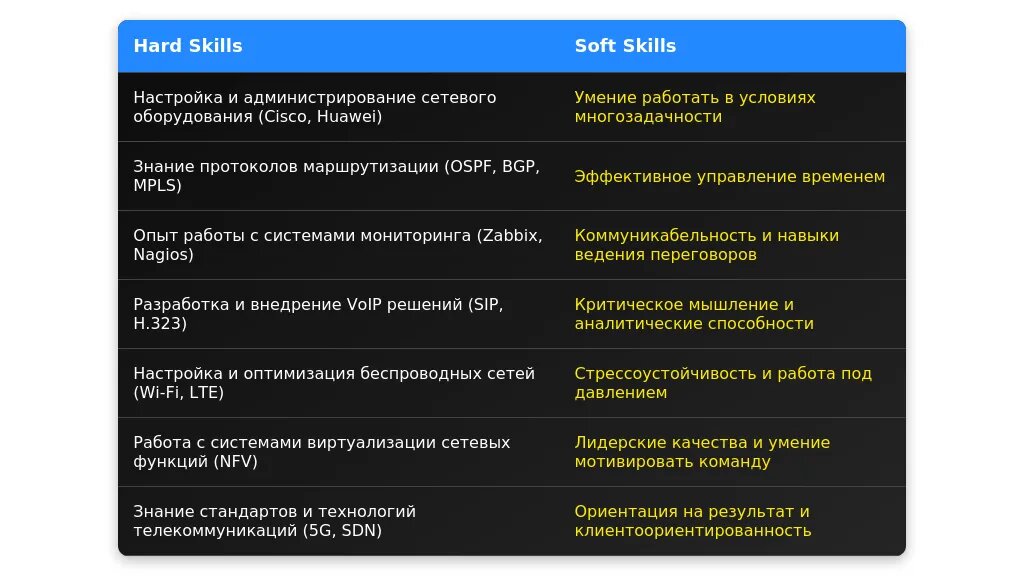 После: Навыки работы с сетевым оборудованием Cisco и Juniper, знание протоколов TCP/IP, BGP, OSPF, опыт настройки VoIP.