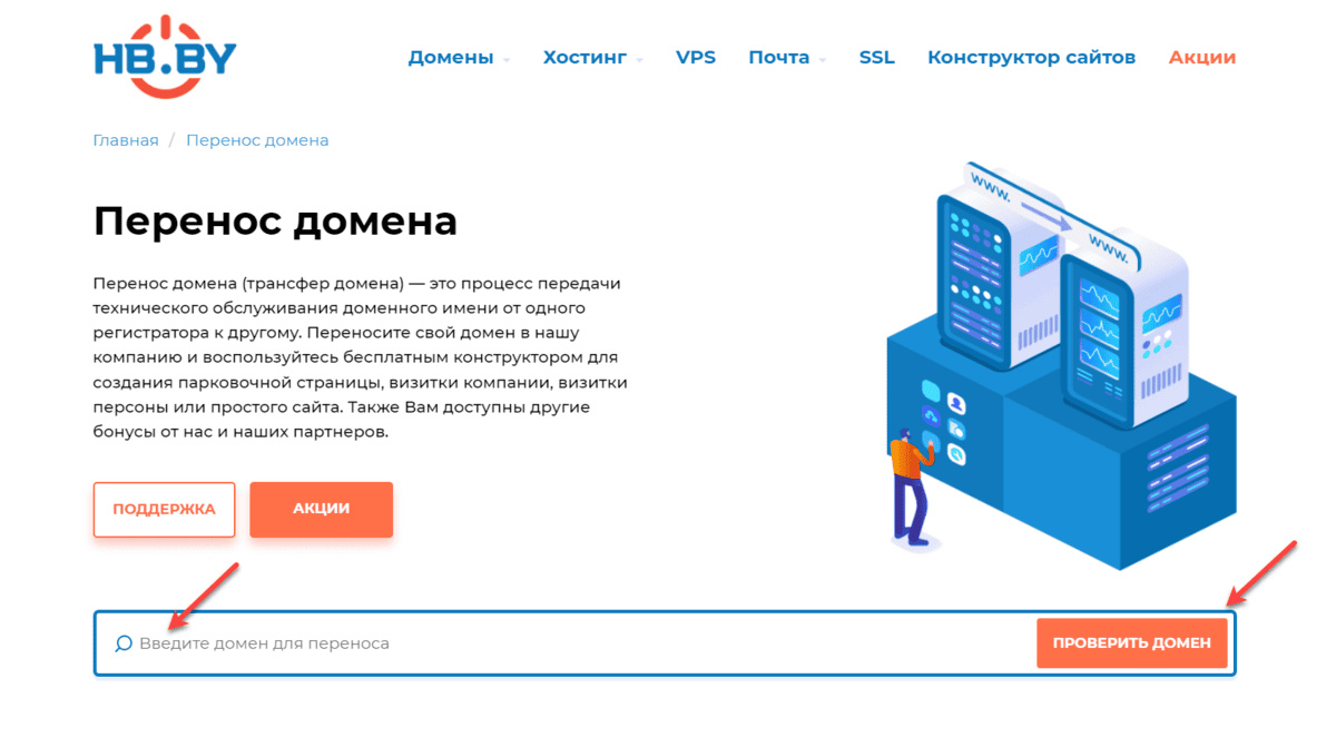 Перенос домена (или трансфер домена) — это процесс передачи технического обслуживания доменного имени от одного регистратора к другому. Важно знать, что инициировать процесс переноса домена может только владелец доменного имени. В отличие от зон BY/БЕЛ, для международных доменов при трансфере оплачивается продление на 1 год. Алгоритм переноса выглядит следующим образом. 1. Подайте заявку HB.BY на трансфер. На сайте есть специальная страница «Перенос домена». Здесь можно ввести домен для переноса, проверить занято или свободно доменное имя. Перенести можно уже зарегистрированный домен. На странице есть возможность посмотреть цену, условия, бонусы и акции и отправить заявку на перенос: Заполните все необходимые для заявки данные. 2. Специалисты HB.BY проверят возможен ли трансфер. В зонах RU и РФ перенос невозможен, если: Срок регистрации домена закончился или заканчивается в ближайшие семь дней.