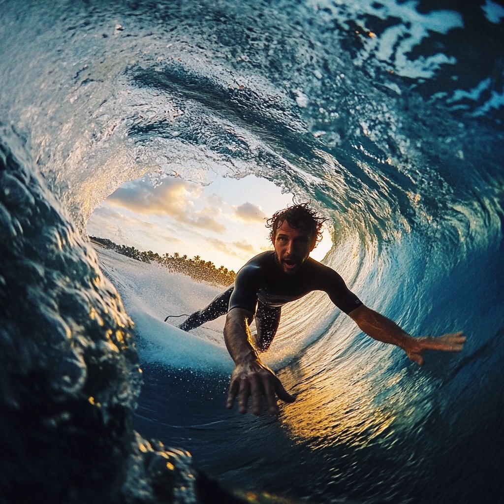Создано на основе запроса: surfing a wave captured with Go Pro in fisheye lens view modus. --- Автоперевод: Серфинг волны, захваченной Go Pro в образе линзы Fisheye. Круто вышло? 🤔 https://dzen.ru/id/65c0c65c86e4f837c27b24d7 #ИИ #AI #нейросеть #midjourney #art