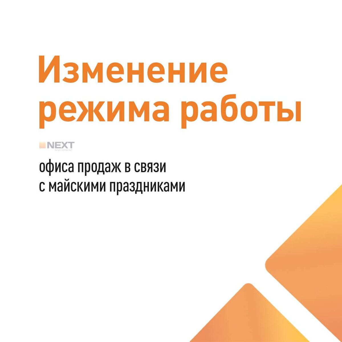 ΠΎΠ΄Π½ΡΠ΅ Π΄Π½ΠΈ: 1, 4, 8, 9, 11 ΠΌΠ°Ρ β ΠΎΡΠΈΡ ΠΏΡΠΎΠ΄Π°ΠΆ Π½Π΅ ΡΠ°Π±ΠΎΡΠ°Π΅Ρ π’ΠΡΠΈ ΡΡΠΎΠΌ 2, 3 ΠΈ 10 ΠΌΠ°Ρ Ρ 10:00 Π΄ΠΎ 16:00 ΠΌΡ Π±ΡΠ΄Π΅ΠΌ ΡΠ°Π±ΠΎΡΠ°ΡΡ Π΄Π»Ρ Π²Π°Ρ ΠΏΠΎ ΠΏΡΠ΅Π΄Π²Π°ΡΠΈΡΠ΅Π»ΡΠ½ΠΎΠΉ Π·Π°ΠΏΠΈΡΠΈ ΠΏΠΎ π36-22-06 βΊ ΠΡΡΡΡ ΠΌΠ°ΠΉ Π±ΡΠ΄Π΅Ρ ΡΡΠΏΠ»ΡΠΌ, Π° ΠΏΠ»Π°Π½Ρ Π½Π° Π½ΠΎΠ²ΠΎΠ΅ ΠΆΠΈΠ»ΡΡ β ΡΠ²Π΅ΡΠ΅Π½Π½ΡΠΌΠΈ! ΠΠ°Ρ Π·Π°ΡΡΡΠΎΠΉΡΠΈΠΊ NEXT Developmentπ§‘