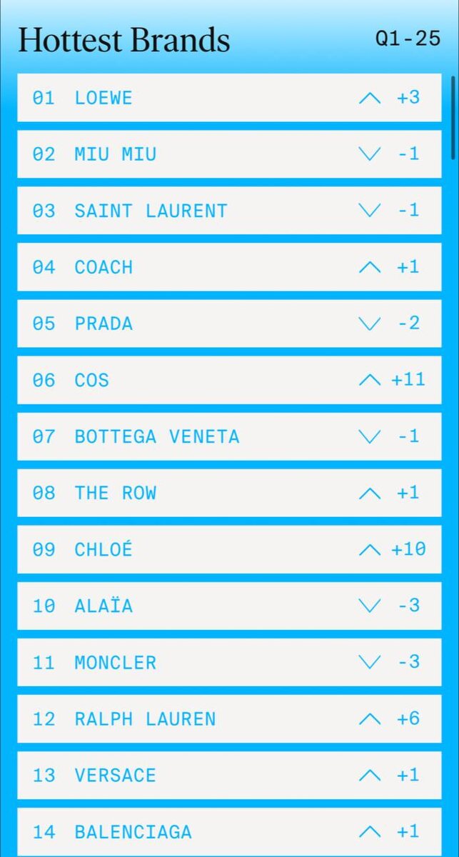 Loewe — самый популярный бренд первого квартала 2025 года. Lyst выкатили свой ежеквартальный рейтинг. Рассказываем подробнее: 🔹После объявления об уходе Джонатана Андерсона поисковые запросы вещей и аксессуаров бренда при его креативном руководстве подскочили на 38%. Так бренд и сместил Miu Miu с первой строчки, которые там располагались последние несколько сезонов. Lyst шутят, мол наступает эра охоты за Old Loewe. 🔹Chloe впервые оказались в топ-10 рейтинге с момента его основания. Все благодаря Чемене Камали и ее бохо. Покупатели очень хотят ее платья с рюшами. 🔹Большой скачок у Cos. Бренд потихоньку выходит из категории масс-маркета, устраивает показы и делает, действительно, желанные вещи пока еще не по люксовому прайсу. Например, широкие брюки, напоминающие по силуэту карго, но без карманов. Модель расположилась на 6-м месте самых популярных вещей квартала. 🔹 Бренд On, как оказалось, впервые вошел в рейтинг Lyst — поисковые запросы увеличились на 50%. 🔹Самой разыскиваемой