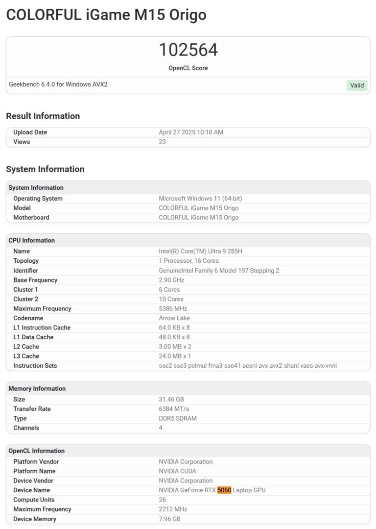 Мобильная RTX 5060 может оказаться производительнее своей предшественницы RTX 4060 на 15-18%. По крайней мере об этом говорит тест в Geekbench OpenCL – утечка от Colorful.