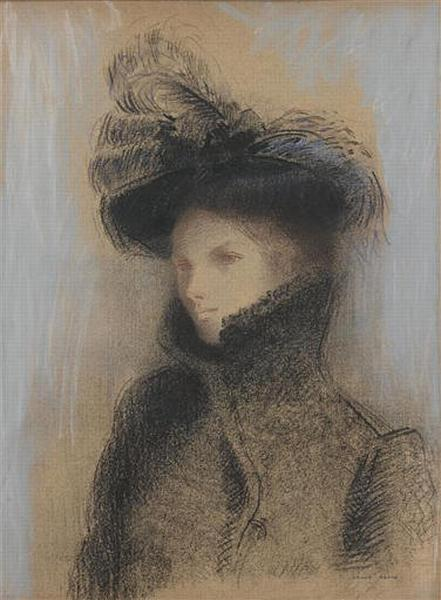 Одилон Редон – один из первых символистов, и этот портрет одновременно и реалистичный, и нереалистичный. Лицо девушки неживое, а как будто из гипса, холодное, бледное, отчужденное, прекрасное. Зато очень реалистично выписано ее пальто, особенно воротник. А как хороша ее шляпка с пышными перьями!
