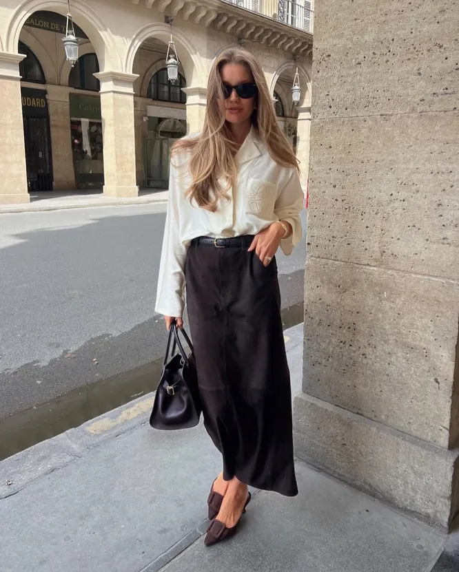 В теплое время года можно расслабиться и позволить себе больше, особенно в выборе длины юбки. Мини-юбка, вопреки стереотипам, может выглядеть сдержанно и даже по-деловому — если правильно её обыграть. Вариант для уверенных в себе девушек: мини из костюмной ткани, дополненная объемным свитером свободного кроя. Такой контраст уравновешивает силуэт, делает образ чуть более расслабленным, и всё еще уместным в рабочей обстановке. Кожаная юбка