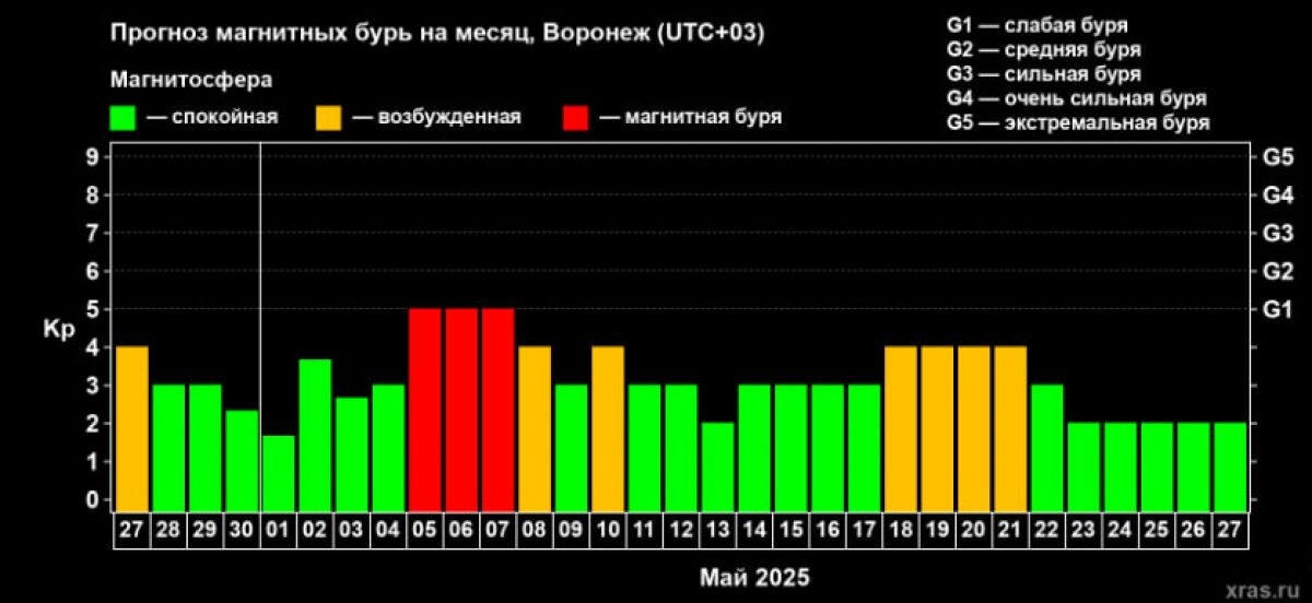 Магнитные бури обойдут стороной воронежцев во время майских праздников. Но за это потом придется ответить. Об этом сообщили астрономы из лаборатории солнечной астрономии ИКИ РАН и ИСЗФ. В настоящее время основным фактором космической погоды, как и в предыдущие недели, остаются корональные дыры, которые формируют быстрый солнечный ветер. Согласно прогнозу, ближайшая встреча с таким потоком ожидается в предстоящие выходные — в воскресенье или понедельник. Таким образом, первые четырехдневные праздничные выходные должны пройти спокойно. Скорость солнечного ветра не превысит 500 км/с, что находится в пределах нормы. Геомагнитный индекс Kp останется в диапазоне от 1 до 3, что соответствует зелёной зоне. А дальше - слабая магнитная буря. Предварительно, она начнется утром 5 апреля и продержится до вечера 7 апреля. Напомним, ранее сообщалось о том, что на майские праздники в Воронеже пройдут магнитные бури. Согласно прогнозу, геомагнитная активность в регионе усилится уже первого мая, а на сл