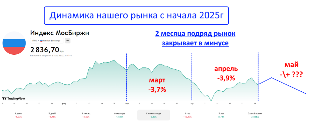 Уже 5 лет и 3 месяца я создаю капитал и пассивный источник дохода на фондовом рынке. Через 4 дня у меня будет зарплата, часть которой я инвестирую в акции. Проанализировав рынок, я выделил для себя несколько привлекательных дивидендных бумаг, которые планирую добавить в свой портфель в мае. Делюсь списком покупок с вами! Два предыдущих месяца (март-апрель) рынок закрывал в минусе. Май уже начался с падения и судя по анализу исторической динамики рынка, который я делал в прошлой статье, май может подтвердить свой статус худшего месяца в году для рынка акций и так же принести убыток. Всему виной геополитика! Трамп не смог закончить конфликт между РФ и Украиной ни за 1 день (как обещал), ни за 100 дней своего президенства. К тому же, на днях США отказались от роли посредника в переговорах между РФ и Украиной и заговорили о возможности ввода санкций против нашей страны вместе с ЕС, который уже разрабатывает 17-й пакет санкций, если Россия не пойдёт на уступки. Я всегда открыто и честно пок