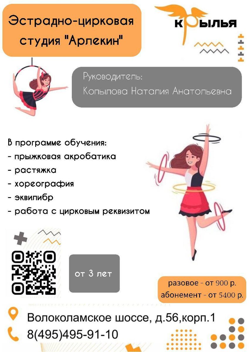 Дорогие друзья! Хотим снова напомнить, что у нас работает эстрадно-цирковая студия “Арлекин”! 🌈✨ 🤸♀️ В нашей программе: – Прыжковая акробатика – Растяжка – Хореография – Эквилибр – Работа с цирковым реквизитом 👶 Приглашаем детей от 3 лет! 🕐 Занятия проходят по субботам и воскресеньям с 11:00 до 12:00 💸 Стоимость: – Разовое занятие: от 1000 ₽ – Абонемент: от 6000 ₽ 📍 Адрес: Волоколамское шоссе, д. 56, корп. 1 📞 Запись по телефону: 8 (495) 495-91-10 (будни с 10:00 до 18:30) ✨ Ждём всех желающих попробовать что-то новое и необычное! Цирковое волшебство ближе, чем вы думаете! 🎪