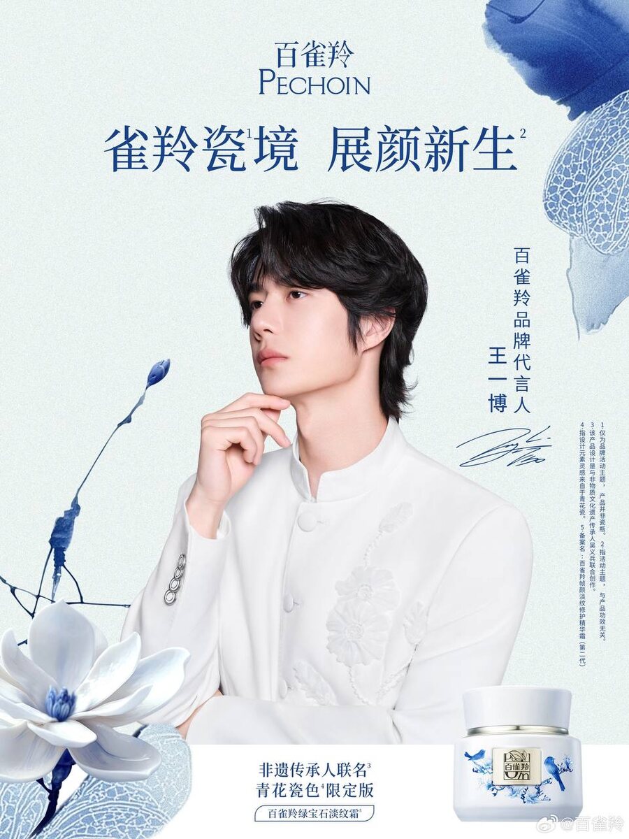Сама нежность... 🤍💙 Обновление Weibo Pechoin 30/04/2025 «Бело-голубой узор собирает в себе сияние, подчёркивая новый образ крема от морщин Pechoin Emerald. Обновите лицо с представителем Pechoin Ван Ибо. Дотроньтесь до текстуры времени и воплотите красоту Востока.» #РекламаВанИбо #Pechoin #WangYibo #ВанИбо