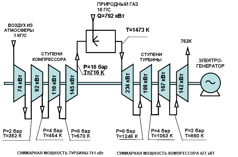 На рисунке приведены результаты расчета мощностей сжатия каждой ступени компрессора и мощности каждой ступени турбины при единичном расходе воздуха 1 кг/с, а также температуры воздуха и продуктов сгорания после каждой ступени. Температуру перед первой ступенью турбины принимаем 1200 град. Цельсия или 1473 Кельвина (в дальнейшем для простоты пишем Ц и К). Разность мощностей турбины и компрессора 314 кВт, количество тепла для нагрева в камере сгорания -792 кВт (что требует расхода природного газа 16 грамм/с). С учетом КПД электрогенератора и степени полноты сгорания в камере сгорания получается КПД установки 35,5%.