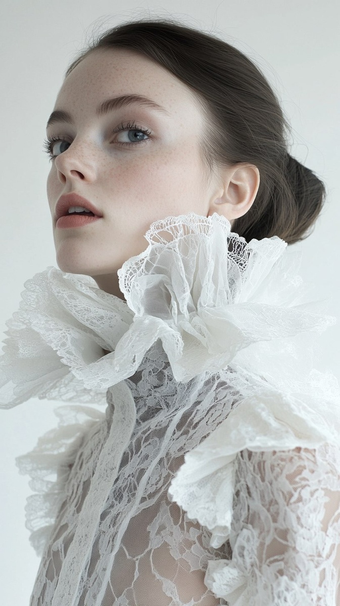 Создано на основе запроса: woman in modern lace caul, ruffles modern collar, fashionable