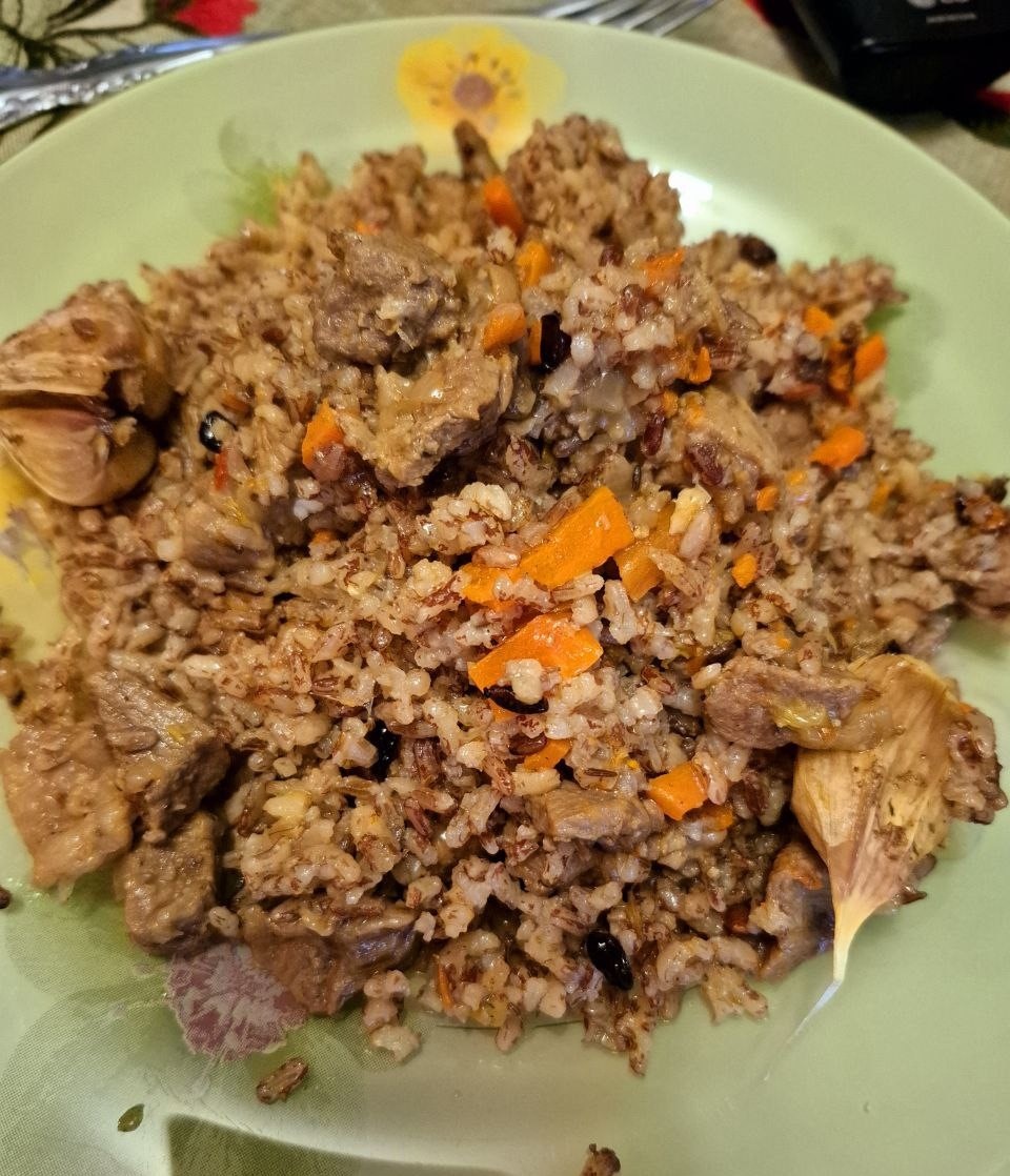Бараний жир (курдюк) режем мелким кубиком. Жир обжариваем в жаровне до золотистого цвета, откладываем в сторону (шкварки можно присыпать солью и съесть). В полученный вытопленный жир добавляем четвертинки лука, обжариваем до золотистого цвета, выбрасываем. Добавляем в жир мясо. Жарим примерно 10 минут под крышкой, периодически помешивая. К мясу добавляем мелко порезанный лук, перемешиваем, жарим под крышкой еще 10 минут, периодически помешивая. Добавляем морковь, перемешиваем и добавляем соль, перец, приправы по вкусу, зиру. Все перемешиваем и жарим еще 15 минут, периодически помешивая. Добавляем рис, распределяем его равномерно по всей поверхности жаровни, сверху укладываем барбарис и заливаем воду (примерно на 1 см выше уровня риса). Когда уровень воды сравняется рисом, добавляем неочищенный чеснок. Тушим