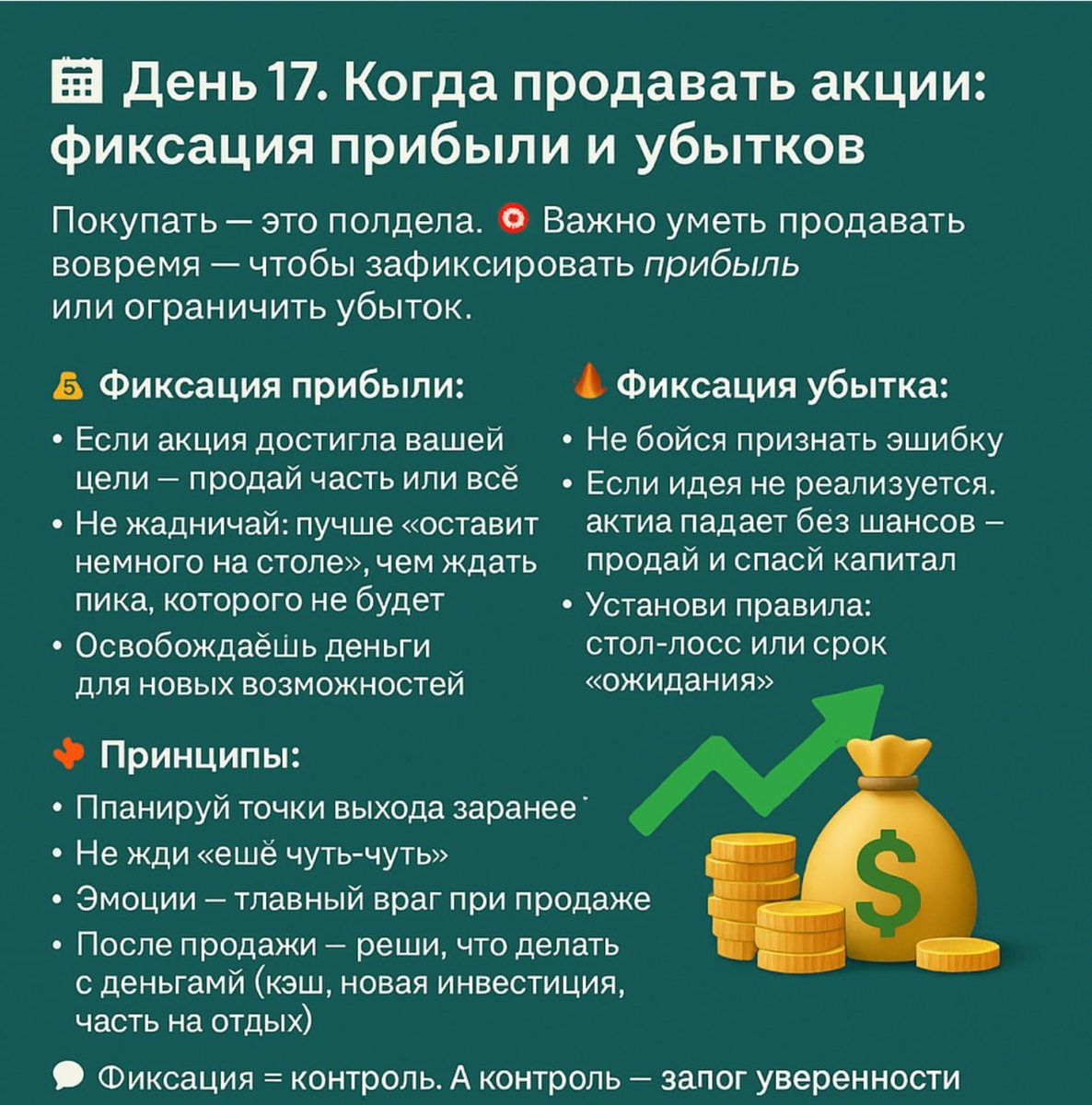 📆 День 17. Когда продавать акции: фиксация прибыли и убытков Покупать — это полдела. 🎯 Важно уметь продавать вовремя — чтобы зафиксировать прибыль или ограничить убыток. 💰 Фиксация прибыли: – Если акция достигла вашей цели — продай часть или всё – Не жадничай: лучше “оставить немного на столе”, чем ждать пика, которого не будет – Освобождаешь деньги для новых возможностей 🔥 Фиксация убытка: – Не бойся признать ошибку – Если идея не реализуется, актив падает без шансов — продай и спаси капитал – Установи правила: стоп-лосс или срок “ожидания” 📌 Принципы: – Планируй точки выхода заранее – Не жди “ещё чуть-чуть” – Эмоции — главный враг при продаже – После продажи — реши, что делать с деньгами (кэш, новая инвестиция, часть на отдых) 💬 Фиксация = контроль. А контроль — залог уверенности в действиях. #день 17 #100днейинвестора Ваша благодарность , поделиться постом