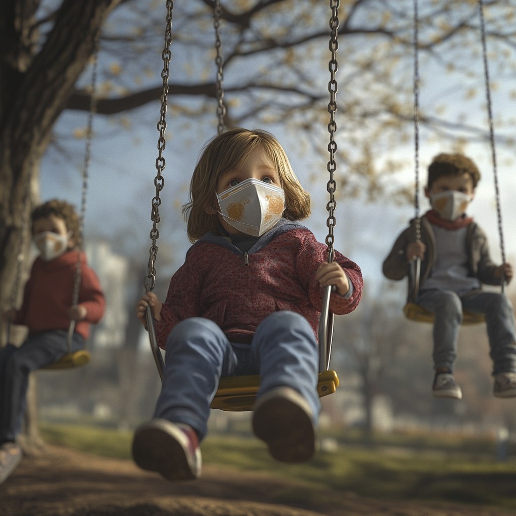 Создано на основе запроса: children in a park, playing on swings, wearing masks across their faces to block out pollution, photo realistic
